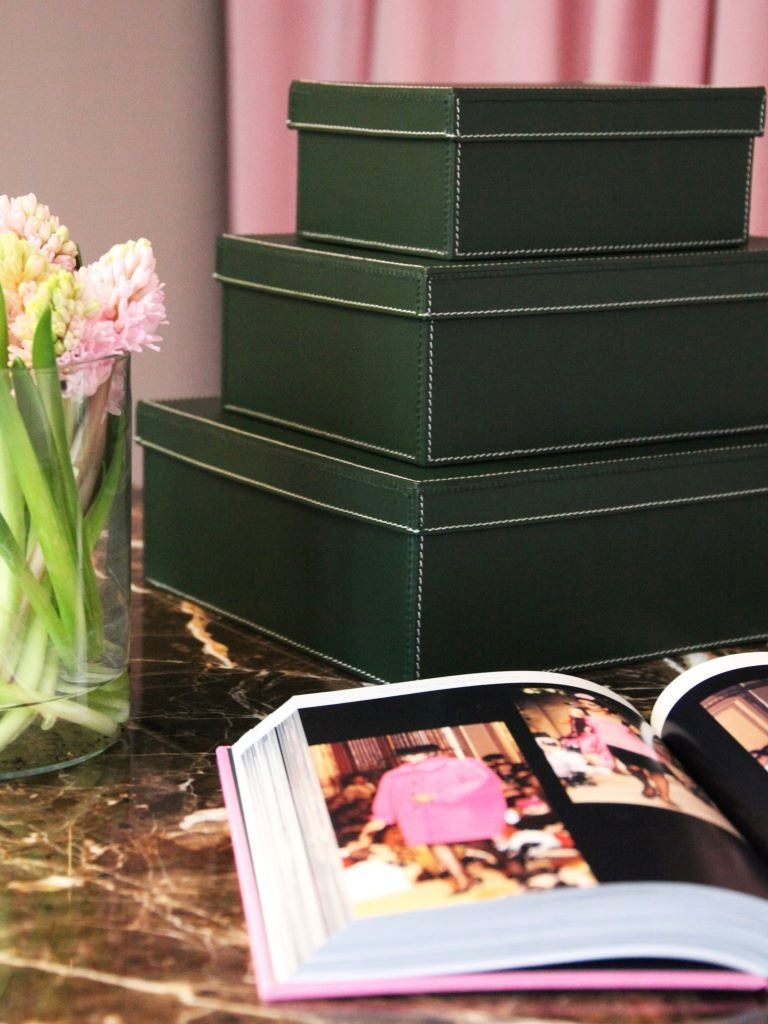 Hochwertige Aufbewahrungsbox mit Deckel und Kontraststeppung, aus recyceltem Leder gefertigt. Ideal für Utensilien und Briefe oder im Kinderzimmer für Spielzeug.
