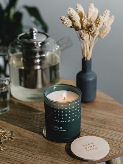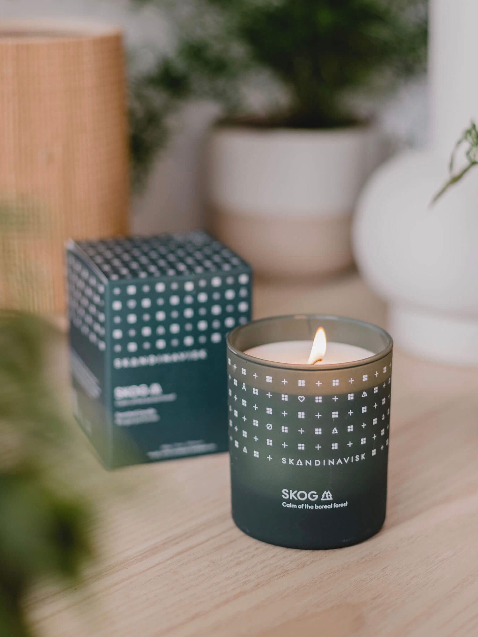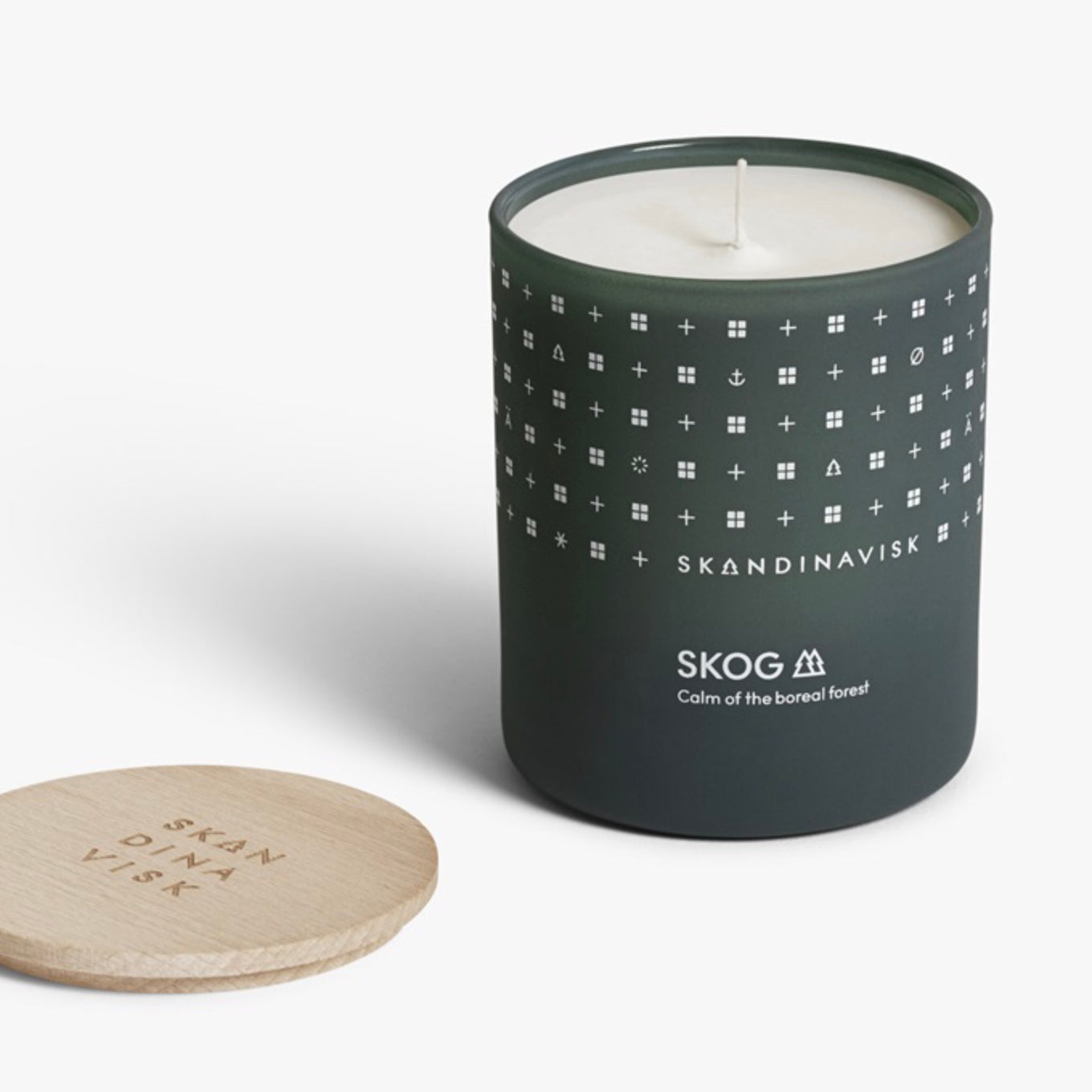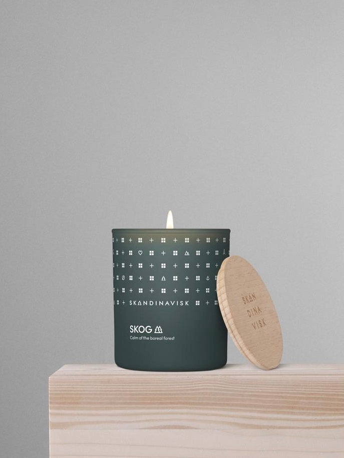 Duftkerze, hergestellt aus Wachs aus nachhaltiger, schwedischer Rapssaat mit Baumwolldocht und mit natürlichen Geruchsstoffen. Belebende Duftnoten von Pinien-und Tannenwäldern, Baumlilien und Leder im dekorativen, bemalten Glasgefäss mit Buchenholzdeckel. Dekorative Verpackung, ideal auch zum Verschenken.