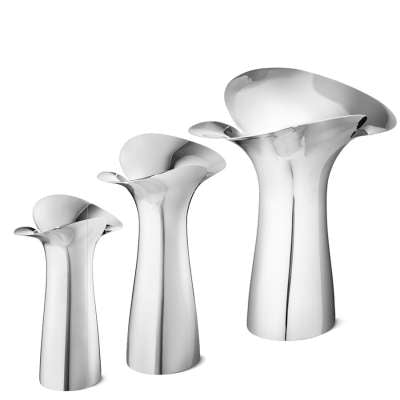 Diese minimalistische und organische Vase aus Edelstahl ist inspiriert von dem Augenblick, in dem sich eine Blütenknospe öffnet und zum ersten Mal ihre Blütenblätter entfaltet. Diese Edelstahlvase fängt den Optimismus eines neuen Frühlings ein, auf den wir uns nach einem langen, dunklen Winter freuen und ist mit und ohne Blumen immer ein stilvoller Blickfang der Wohnung.