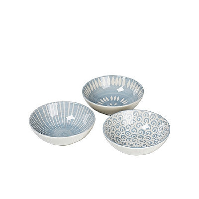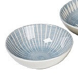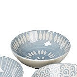 Müslischale mit verschiedenen Dessins in hellblau aus Steingut. Die passenden Kaffeebecher und Dessertteller werden ebenfalls angeboten. Für den Geschirrspüler und die Mikrowelle geeignet. Auch als 3er Set erhältlich.