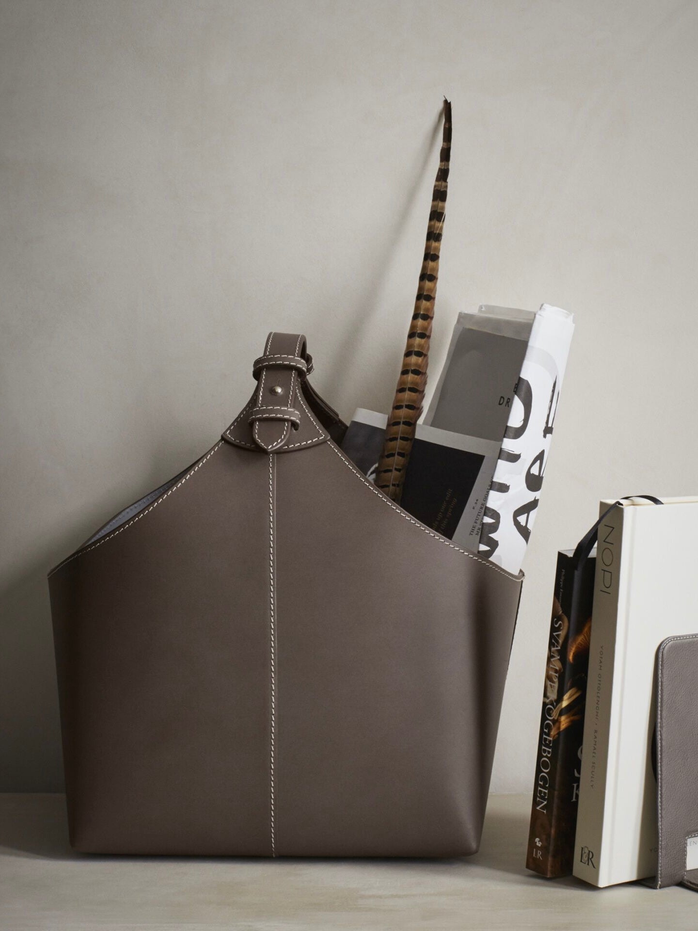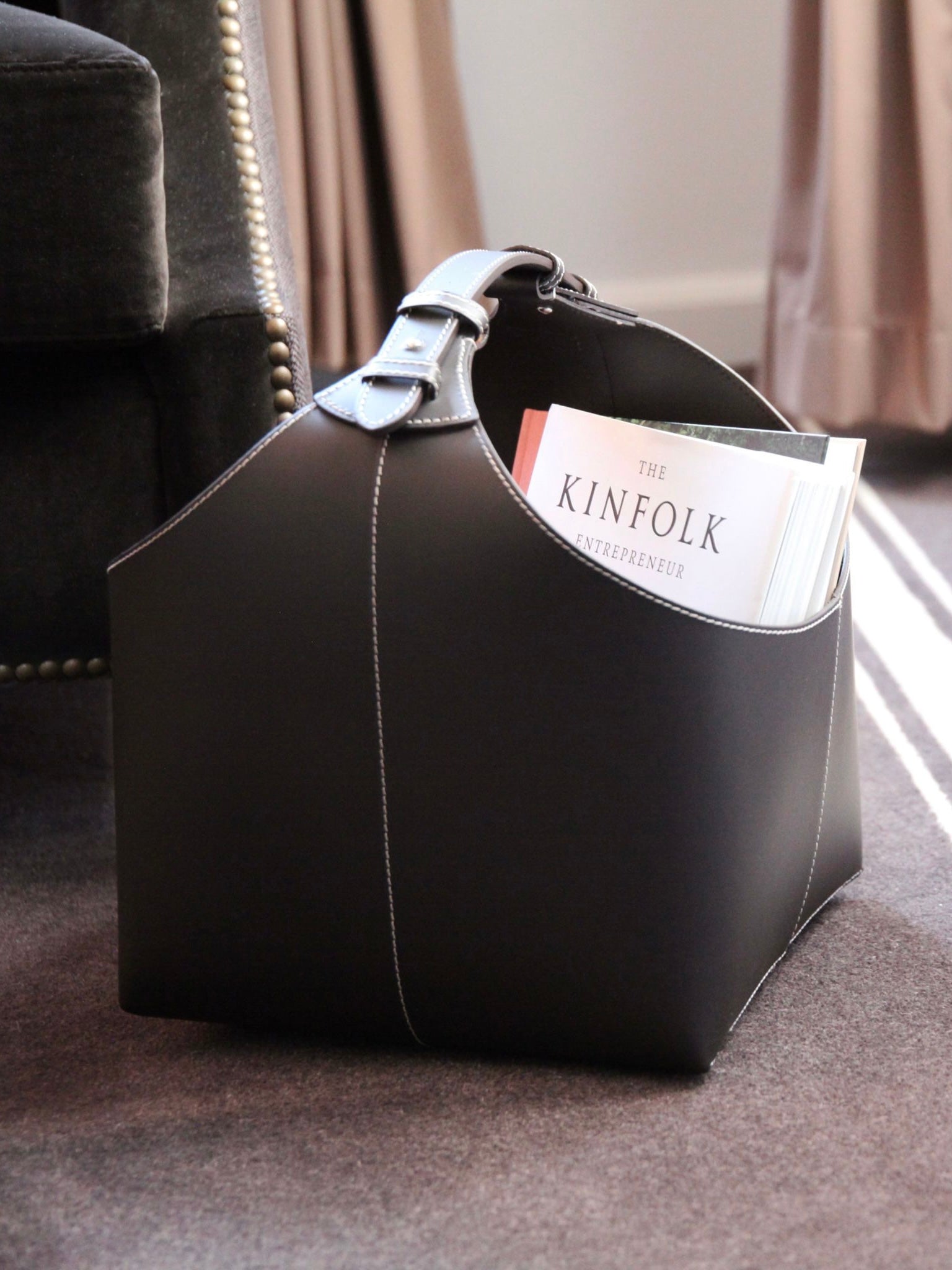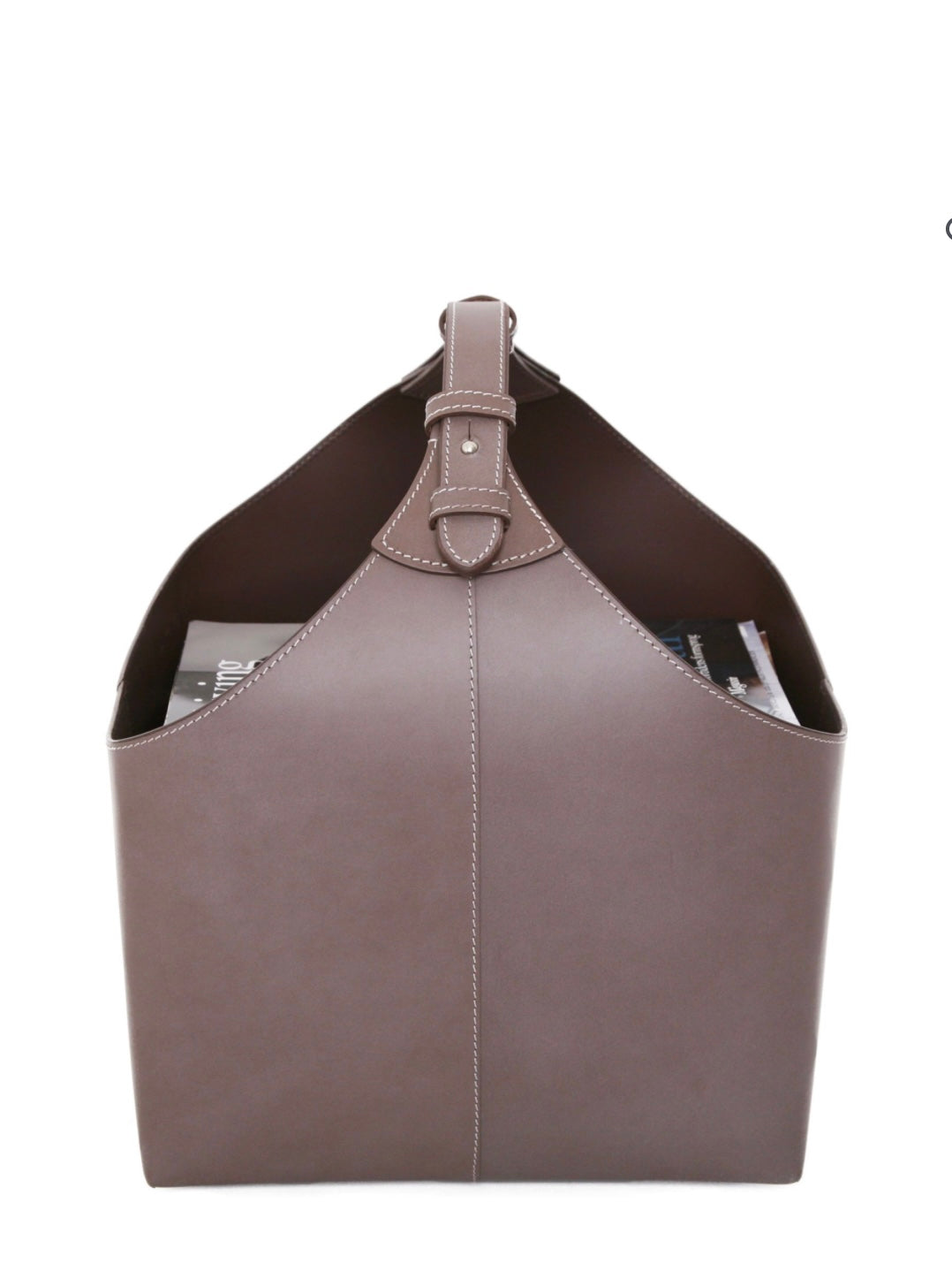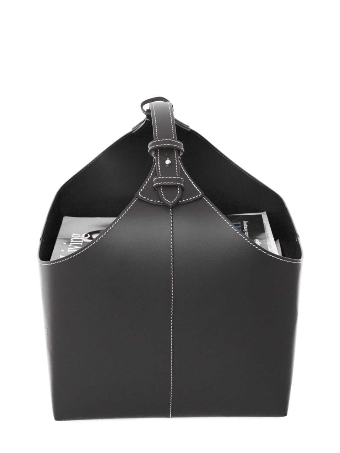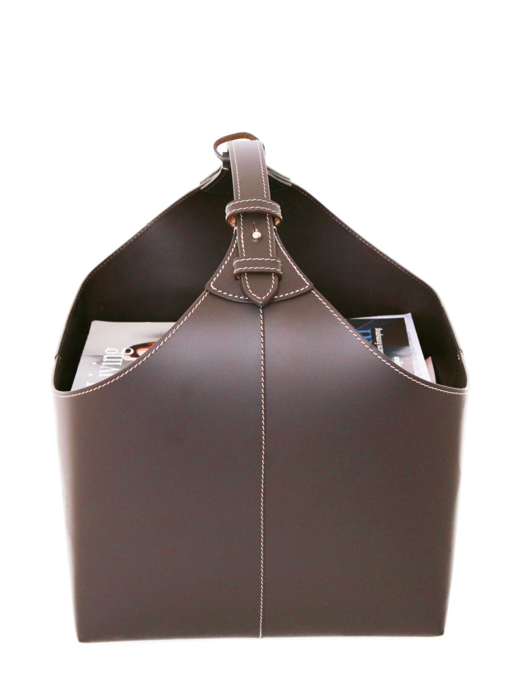 Hochwertiger Zeitungskorb mit Kontraststeppung und praktischem Traggriff, aus recyceltem Leder gefertigt. Alternativ auch als Aufbewahrungskorb für Utensilien zu nutzen.